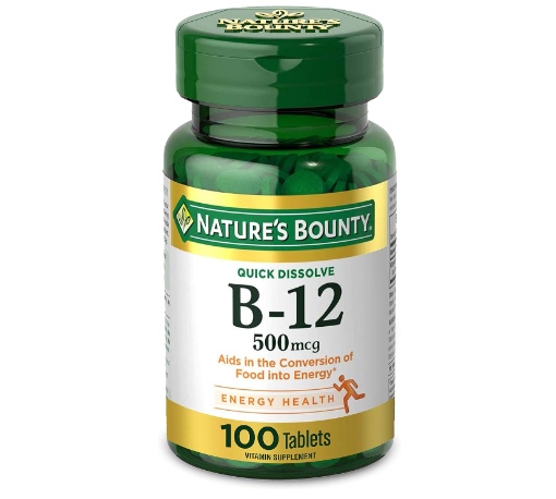 - FOR ENERGY 100-count Vitamin B-12 500mcg Tablets; Nature’s Bounty Quick Dissolve B-12 vitamins play an important role in energy metabolism in the body(1); They help the body convert food into the fuel which is used to produce energy in the body(1)
